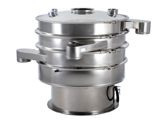 圓形振動(dòng)篩是一種高精度細(xì)粉篩分設(shè)備,其噪音低、效率高,快速換網(wǎng)需3-5分鐘,全封閉結(jié)構(gòu),適用于粒、粉、粘液等物料的篩分過(guò)濾。圓形振動(dòng)篩是由直立式電機(jī)作為激振源,電機(jī)上、下兩端安裝有偏心重錘,將電機(jī)的旋轉(zhuǎn)運(yùn)動(dòng)轉(zhuǎn)變?yōu)樗健⒋怪薄A斜的三次元運(yùn)動(dòng),再把這個(gè)運(yùn)動(dòng)傳遞給篩面。調(diào)節(jié)上、下兩端的相位角,可以改變物料在篩面上的運(yùn)動(dòng)軌跡。